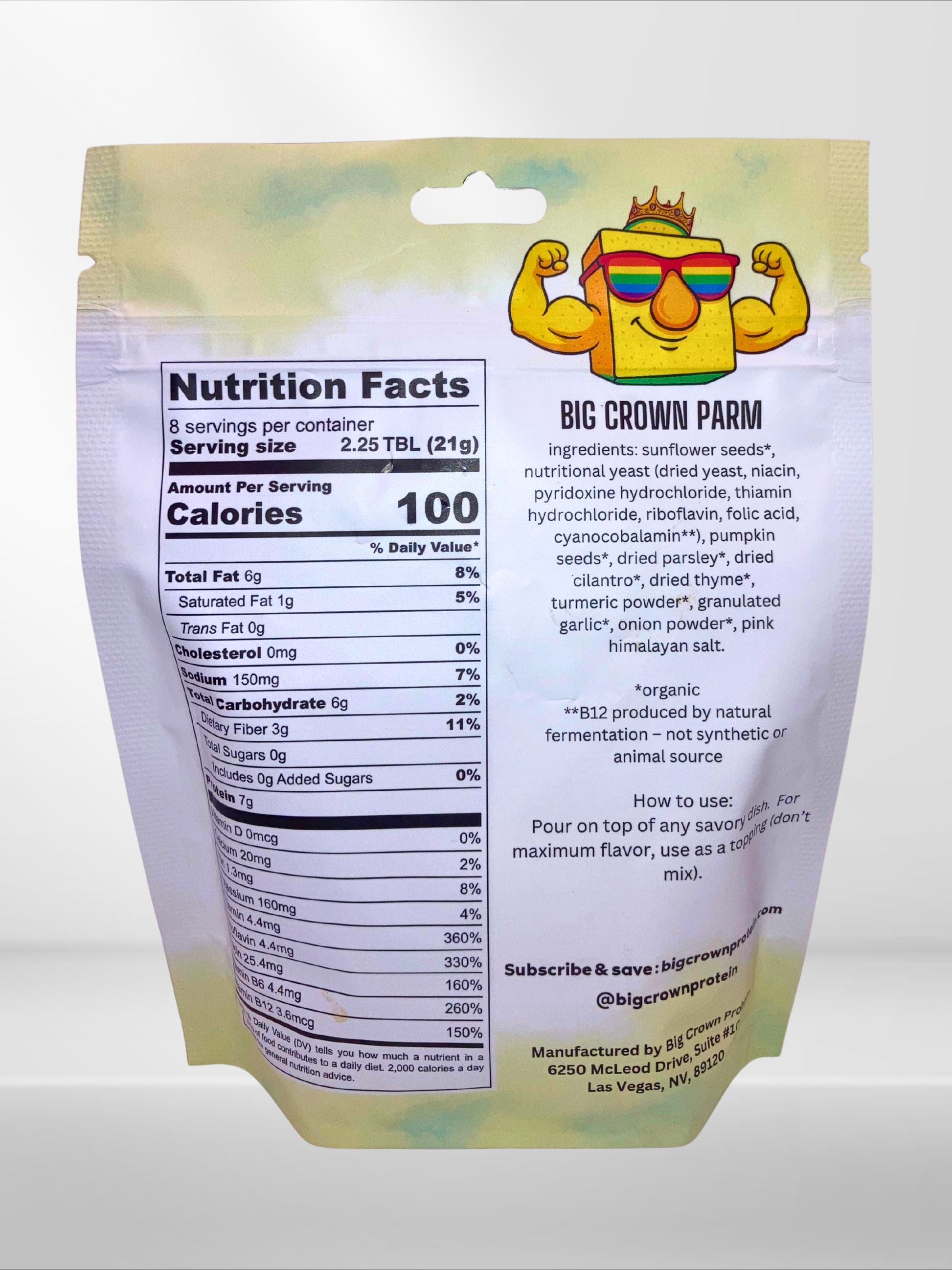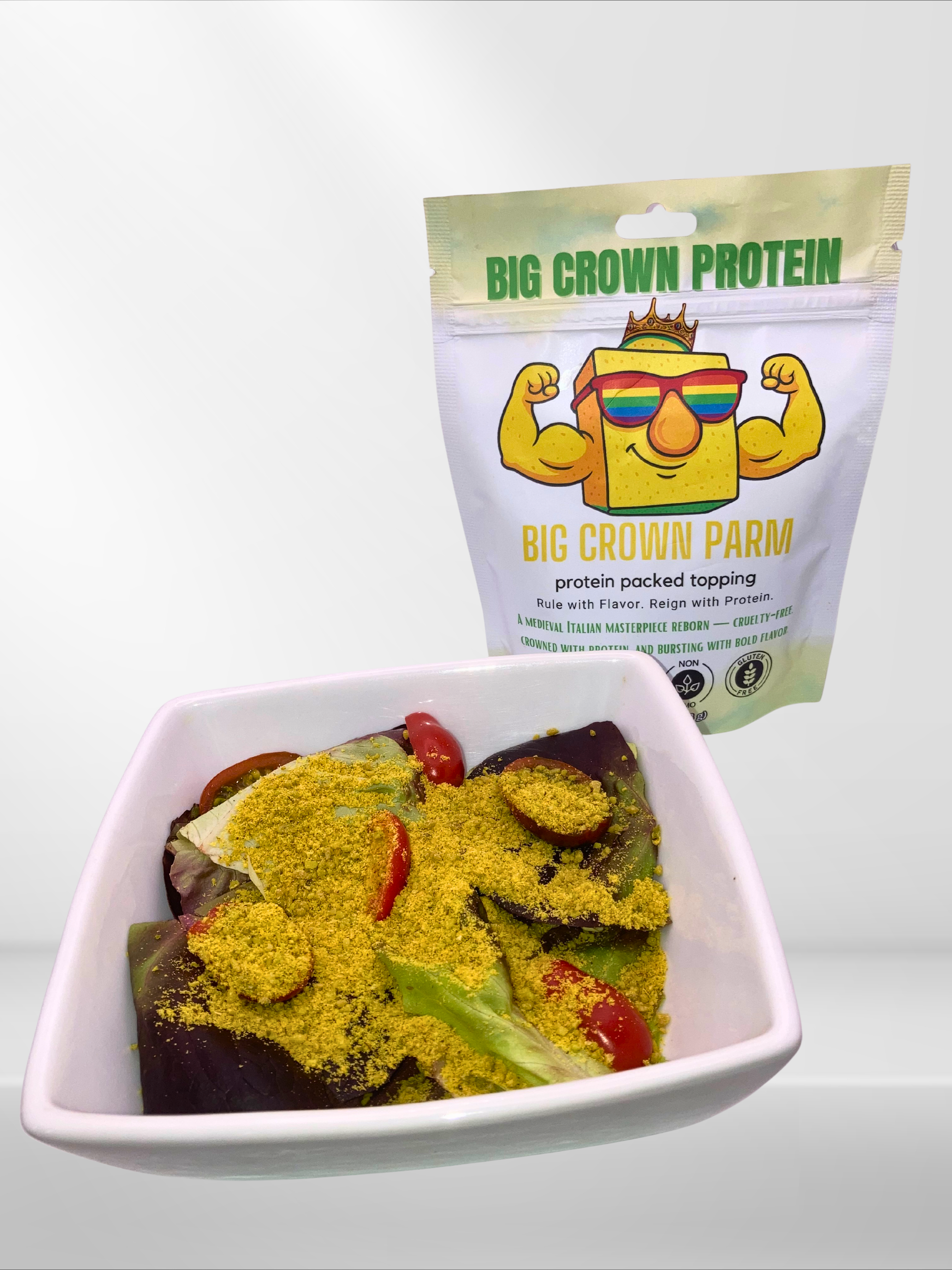 Big Crown Parm is a bold, plant-based protein topping that delivers rich, savory, parmesan-style flavor—without dairy. Crafted from organic sunflower seeds, pumpkin seeds, and nutritional yeast, it’s designed to turn simple meals into elevated, protein-powered dishes with just a shake.