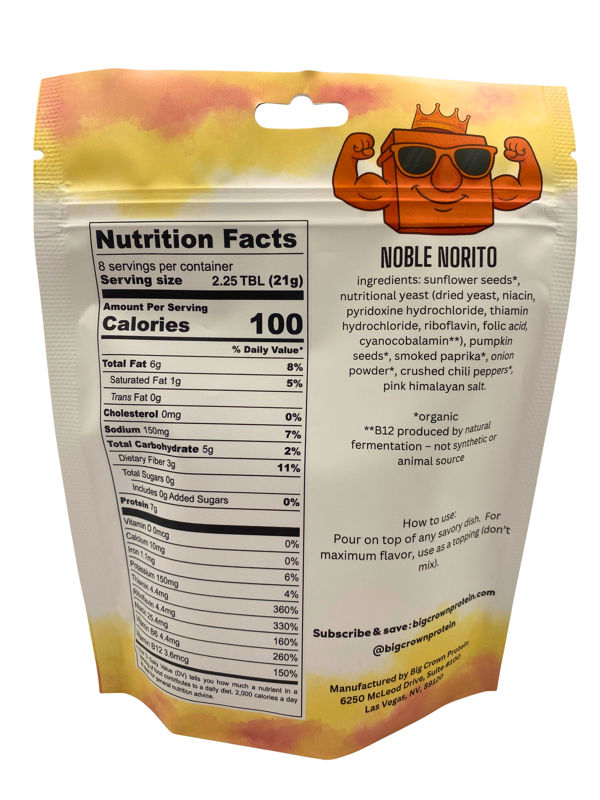 Noble Norito is a bold, savory, plant-based protein topping built to deliver maximum flavor and texture—without blending in or backing down. Made from organic sunflower seeds, pumpkin seeds, nutritional yeast, and layered spices, it’s designed to crown savory foods with a rich, umami-forward bite that instantly levels up any meal.